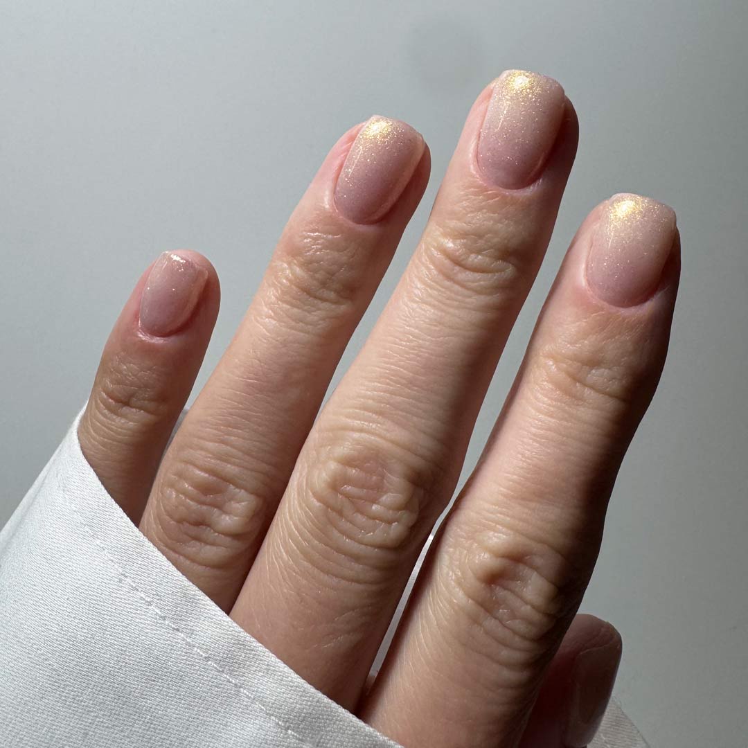 Soft, luminous, and kissed with golden shimmer — Midas transforms every set into a subtle statement of luxury. This sheer neutral base is infused with fine gold micro-shimmer, creating a warm, radiant glow that catches the light beautifully.